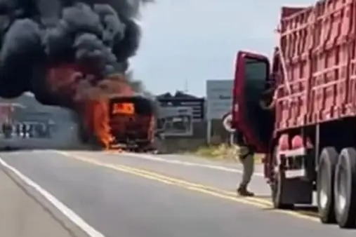 Nesta segunda-feira (19), um ônibus intermunicipal pegou fogo na BR-230, no trecho próximo ao portal de entrada do município de Sousa, no Sertão da Paraíba. O veículo fazia a linha