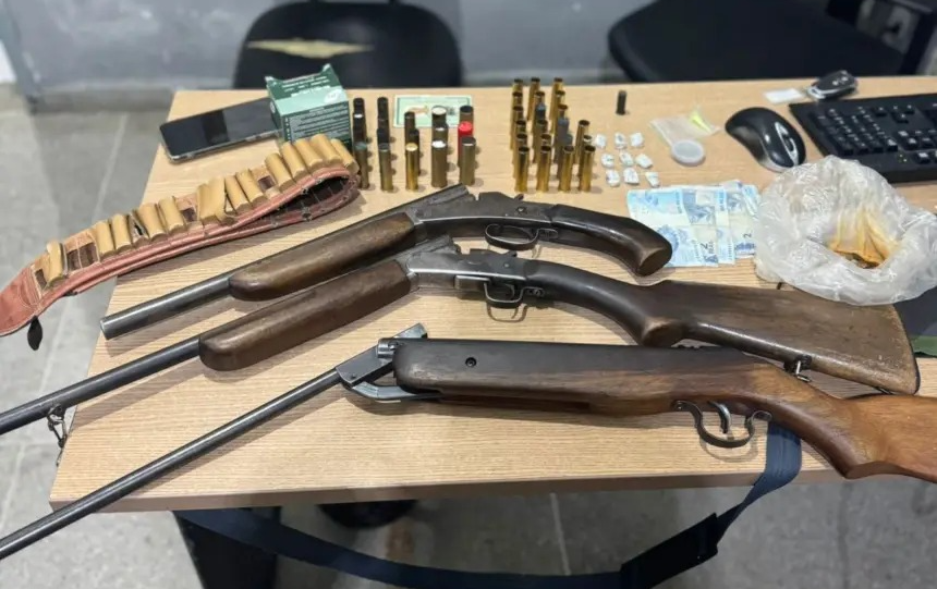 Durante a ação, foram apreendidas três armas de fogo, munições e porções de material semelhante a drogas. O suspeito foi encaminhado à delegacia, junto com os itens recolhidos, para os procedimentos cabíveis e ficou à disposição da Justiça.